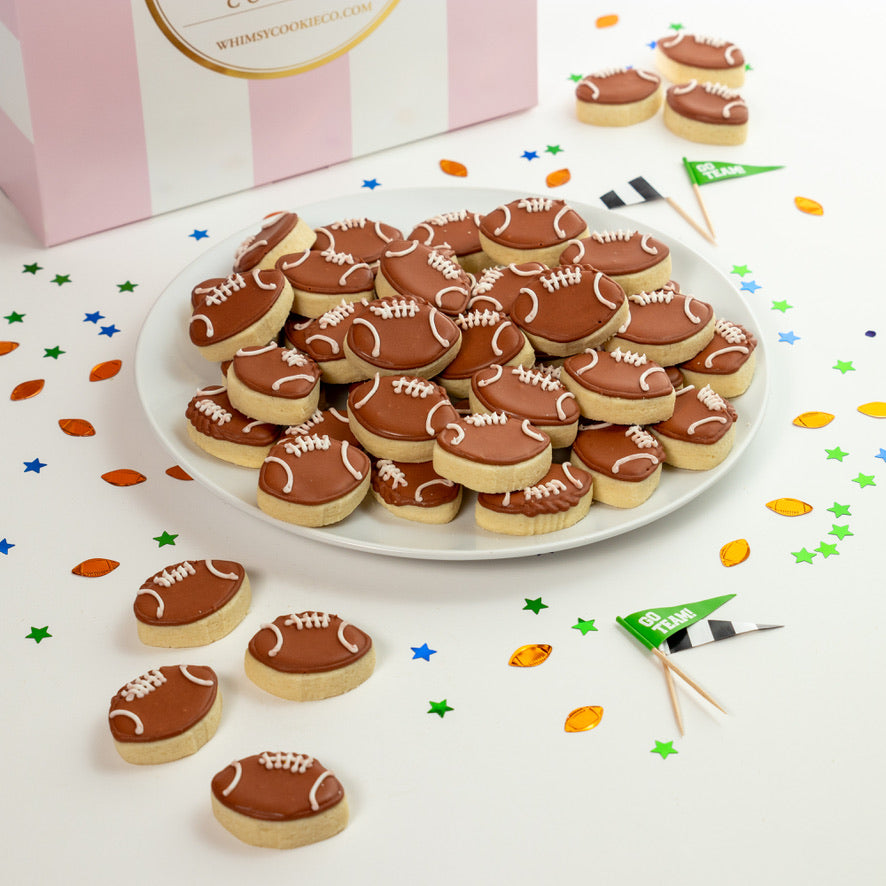 Each set of football bites is made with our thick, soft and yummy sugar cookie recipe. Bites are sealed in a clear cello bag(9 to a bag) and shipped in our signature pink and white box. Â
