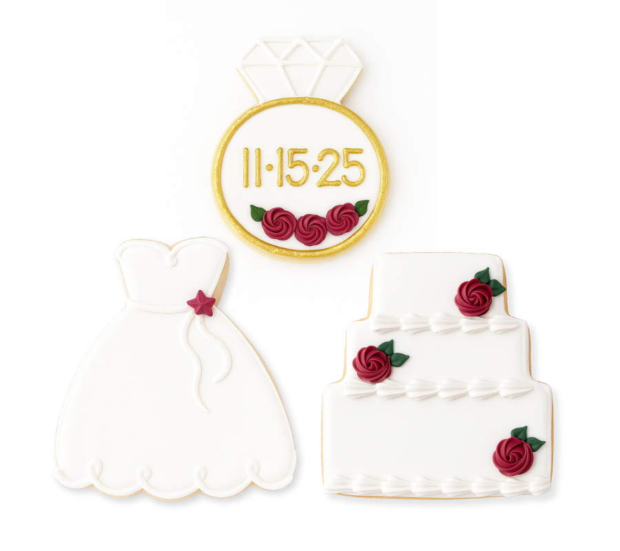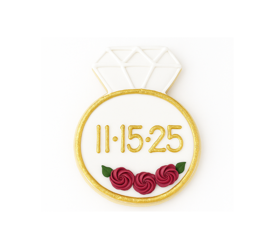 Lets celebrate the bride!! Each set of 12 cookies is made with our incredible sugar cookie recipe, thick, soft and oh so yummy. Each cookie is heat sealed and shipped in our signature pink and white striped box. If you would like a different color(non-metallic) for the rose, let us know in the notes section at check out. Â