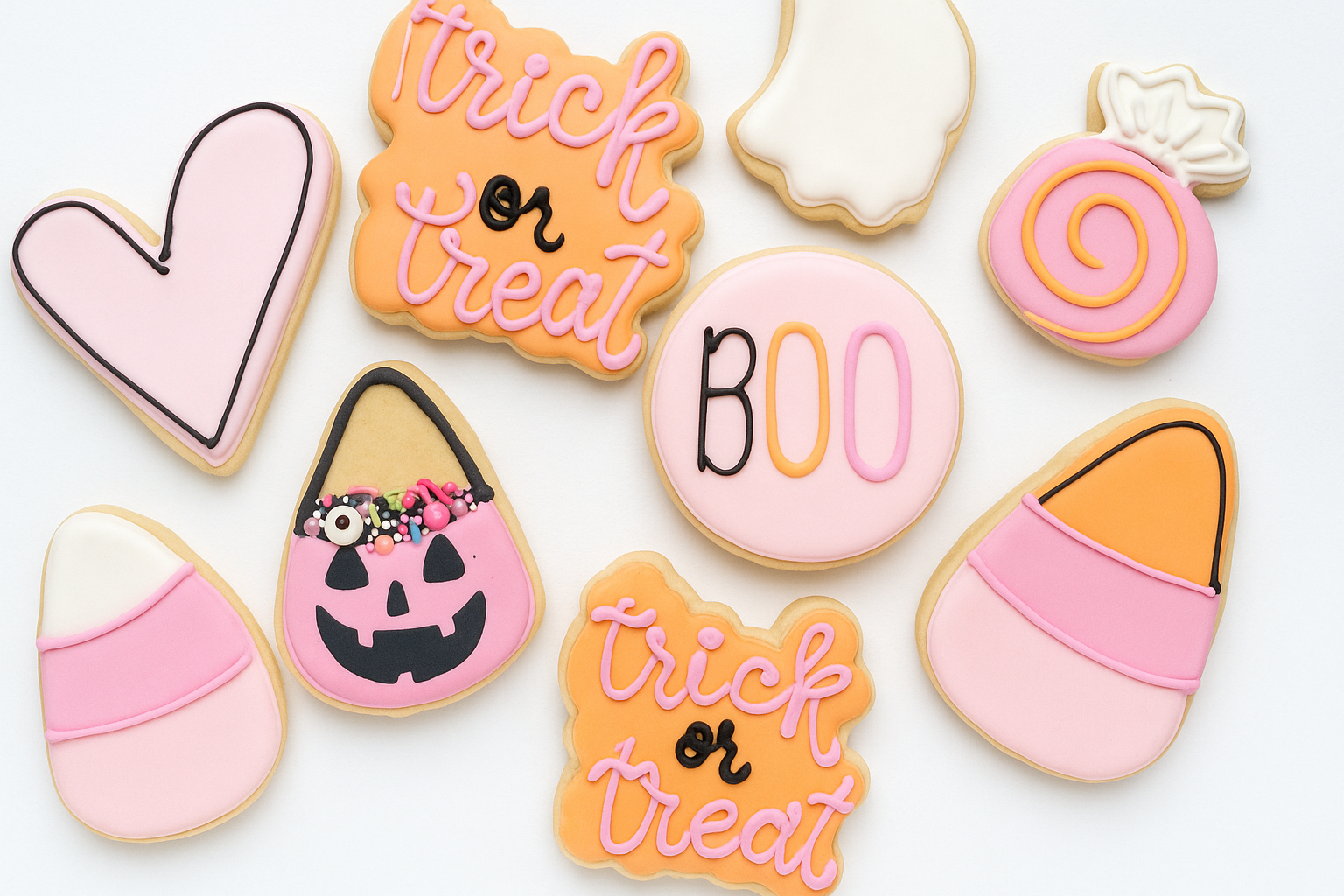 Each set of 12 Halloween cookies is made with our thick, soft, yummy sugar cookie recipe. Each cookie is sealed in a clear cello bag and shipped in our signature pink and white box.Â